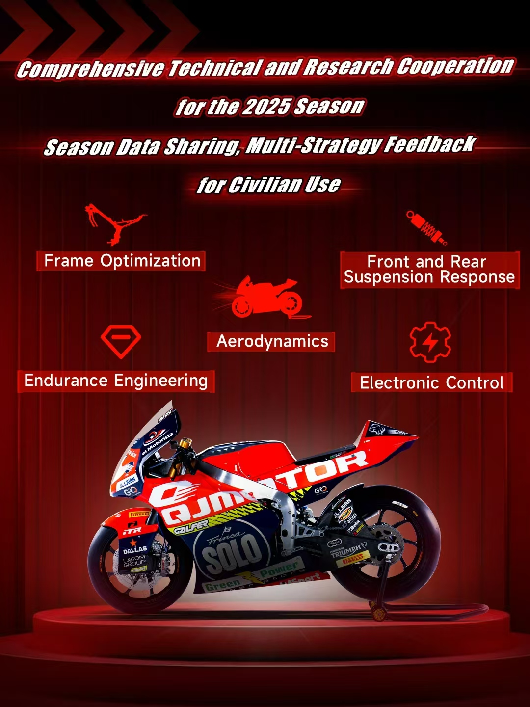 지난 세 시즌 동안 QJMOTOR는 레이스 경험을 쌓고 중요한 데이터를 축적하는 데 집중했으며, 이는 이후 QJMOTOR 스포츠 바이크 시리즈의 발전에 핵심적인 역할을 했다. 2025 시즌부터 QJMOTOR는 스페인의 명문 팀인 MSI와 새로운 협업을 시작했다. QJMOTOR의 탄탄한 모터사이클 산업 배경과 MSI의 독보적인 레이싱 노하우가 만나, 한층 더 높은 시너지를 이끌어낼 것으로 기대된다.